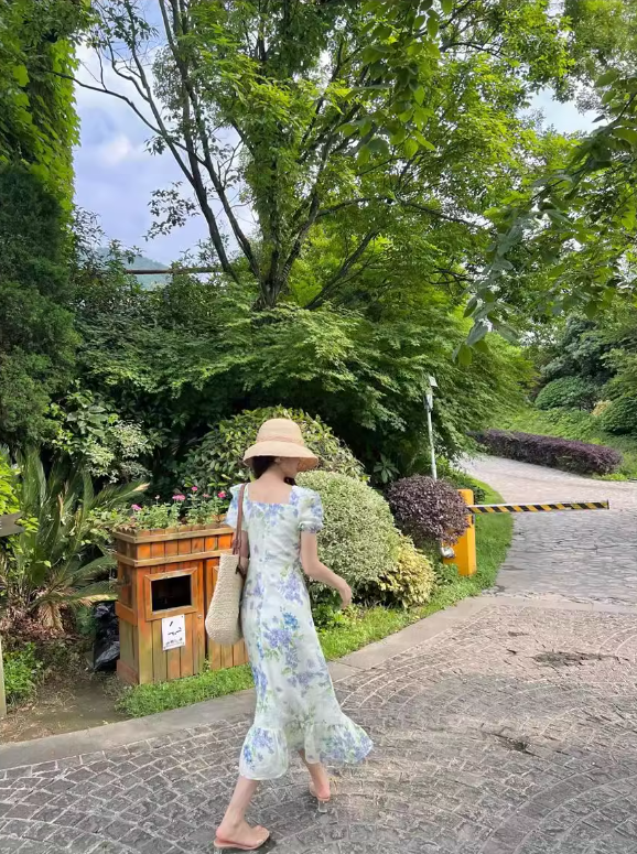 Evafashion floral pastoral style puff sleeve square neck dress HZ1024