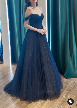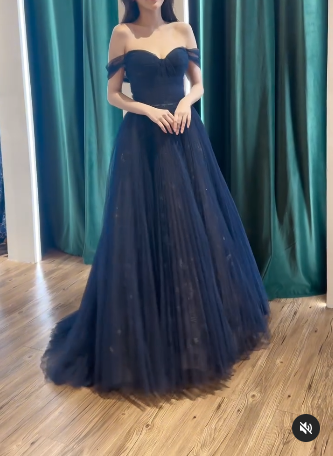 Evafashion Off Shoulder Tulle Lace Dark Blue Long Prom Dress HZ1024