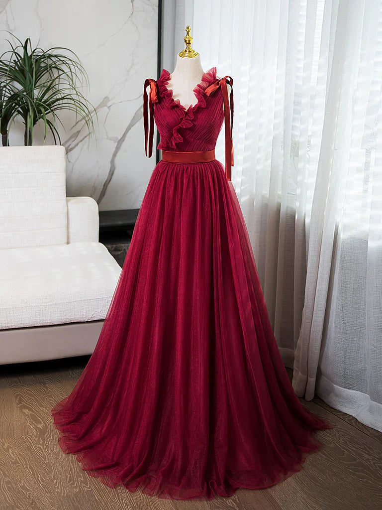 Evafashion V Neck Tulle Burgundy Long Prom Dress, Burgundy Long Evening Dresses HZ1024