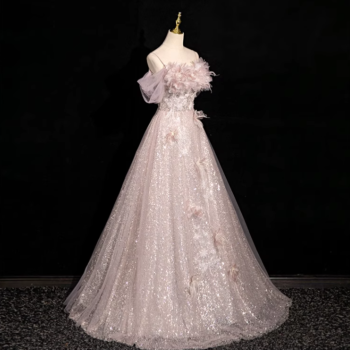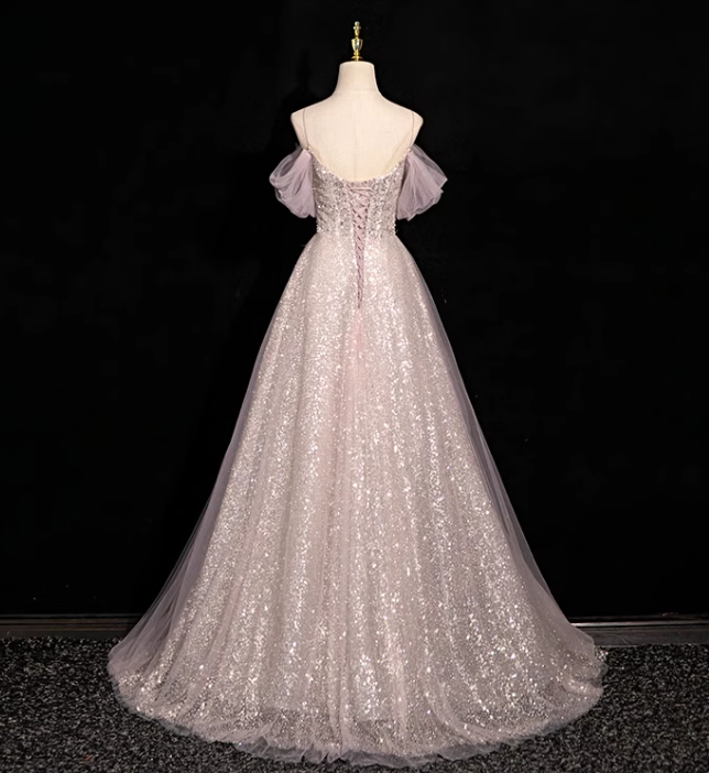 Evafashion A-line off-shoulder sequined tulle long prom dress, pink formal long dress HZ1024