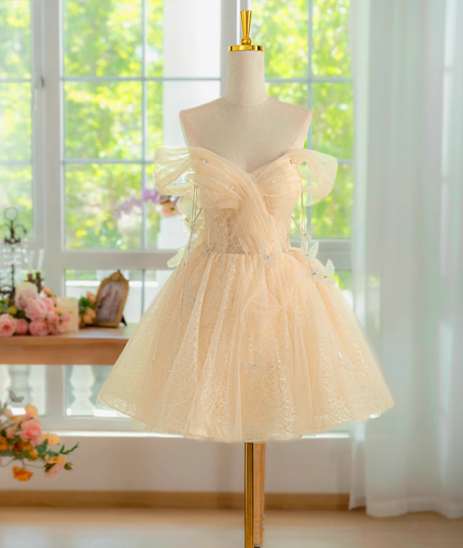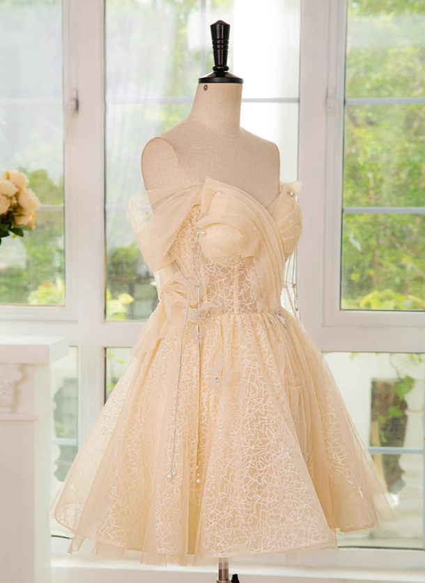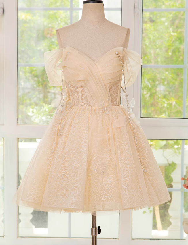 Evafashion A-line off shoulder tulle lace short prom dress, champagne homecoming dress HZ1024