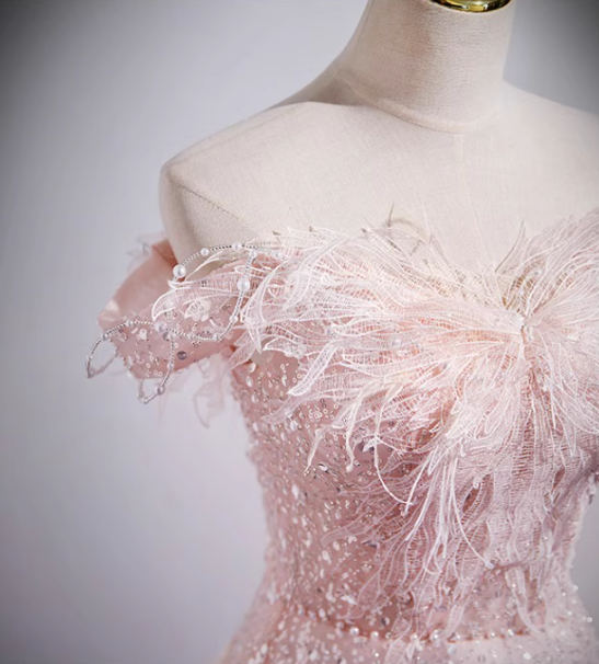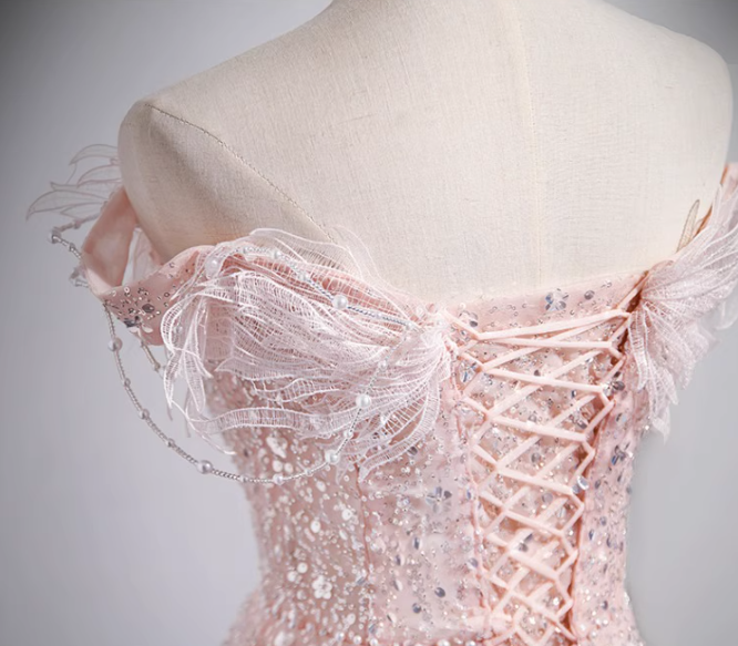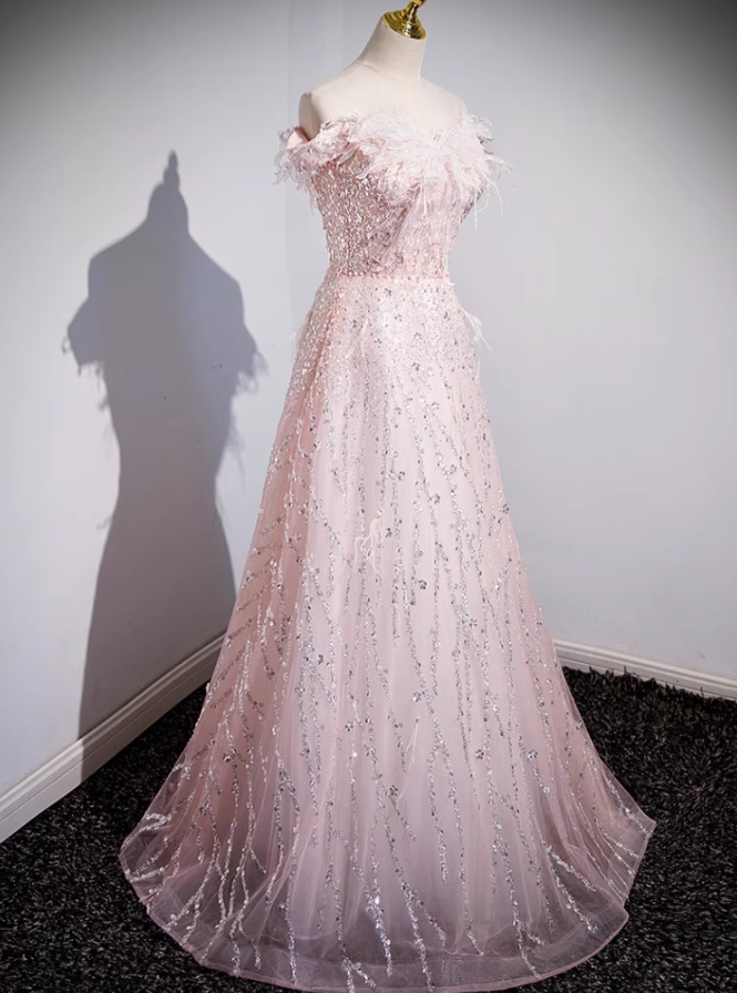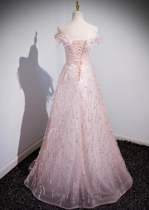 Evafashion A-line off-the-shoulder tulle lace sequined long prom dress, pink evening dress HZ1024