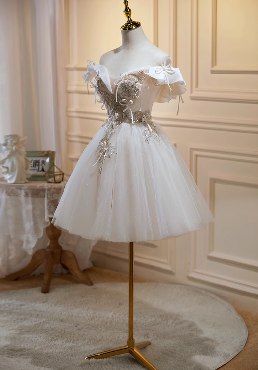 Evafashion A-line off-the-shoulder tulle sequin short prom dress, off-white homecoming dress birthday dress HZ1024
