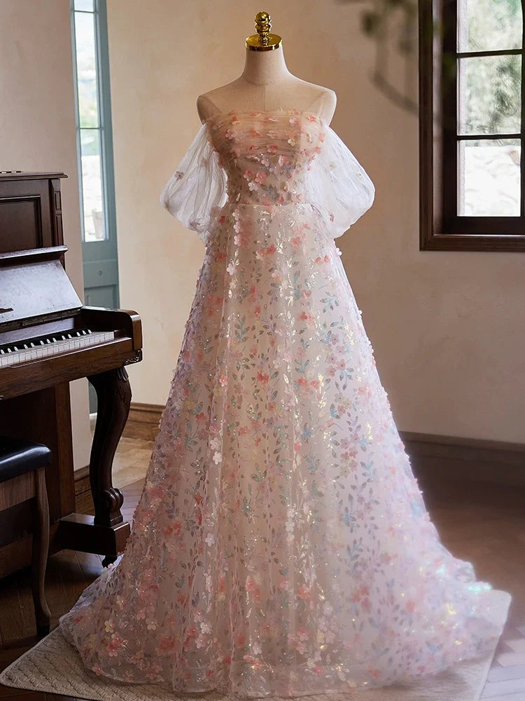Evafashion Off Shoulder Lace Tulle Pink Long Prom Dress, Pink Long Evening Dress HZ1024